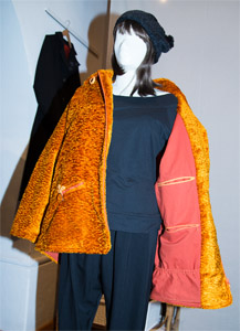 Bequeme Jacke in erdigen Orangetönen mit 2 Außen- und 5 Innentaschen, in die alles reinpaßt, was man unterwegs so braucht. Reißverschluß vorne, an den Außentaschen und am Kragen sind farblich harmonische Lederknöpfe und Knopfschlaufen aus Makrameeschnur.