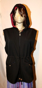 Ärmellose schwarze Weste mit Kapuze, Reißverschluß vorn und Durchzug in der Taille, Taschen vorne. Die schwarze Spitze in der Kapuze ist rot unterlegt.