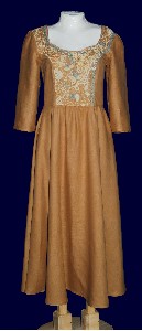 Zweiteiliges Kleid in dunkelrot; bequem mit Trägern und Gummizug unter der Brust, gefüttert; Überteil mit weiten Ärmeln und Spitzenpasse; wird unter der Brust gebunden. Spitze mit Blättermuster in verschiedenen aufeinander abgestimmten Rottönen und Gold.