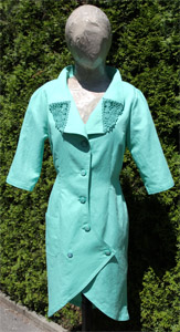 Weitschwingender Rock mit Reißverschluß rückwärts und Taschen in den Seitennähten, zusätzlich sorgt ein Gummibund für Bequemlichkeit. Figurnahes Oberteil mit Borte am Ausschnitt und an den Ärmeln. Die Farbe der eingearbeiteten Perlen liegt zwischen Messing und Gold, die Knöpfe sind messingfarben.
