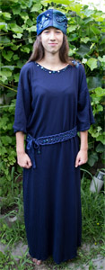 Schlichtes, harmonisches Ensemble in Dunkelblau-Tönen, mit violett bis türkis schimmernden Perlen bestickt. Das Kleid ist elastisch, der gehäkelte Bindegürtel ist ebenso etwas nachgiebig.
