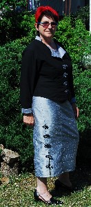 Zweiteiler mit üppiger Spitze im rechten Vorderteil und Einzelblatt im Rocksaum. Verschiedene Rosétöne, dunkelrot, cremefarben und hellbraun sind kombiniert zu Weinblättern, Ranken und Trauben, zusätzlicher Schimmer durch kleine rosa Perlen. Das Oberteil ist vorne durchgeknöpft und hat rechts eine kleine Eingrifftasche, Rock mit Reißverschluß rückwärts.