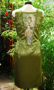 Olivgrünes schimmerndes Etuikleid mit Spitze aus Weinblättern, Ranken und Trauben, farblich harmonisch abgestimmt in verschiedenen Olivgrüntönen, cremefarben und hellbraun, teilweise mit feinen Goldfäden akzentuiert. Die großzügige Rückenspitze mündet in einer einzigen Ranke, die über den Träger nach vorn läuft und im Dekolleté in einem Weinblatt endet. Reißverschluß seitlich, Schlitze vorn seitlich, gefüttert.